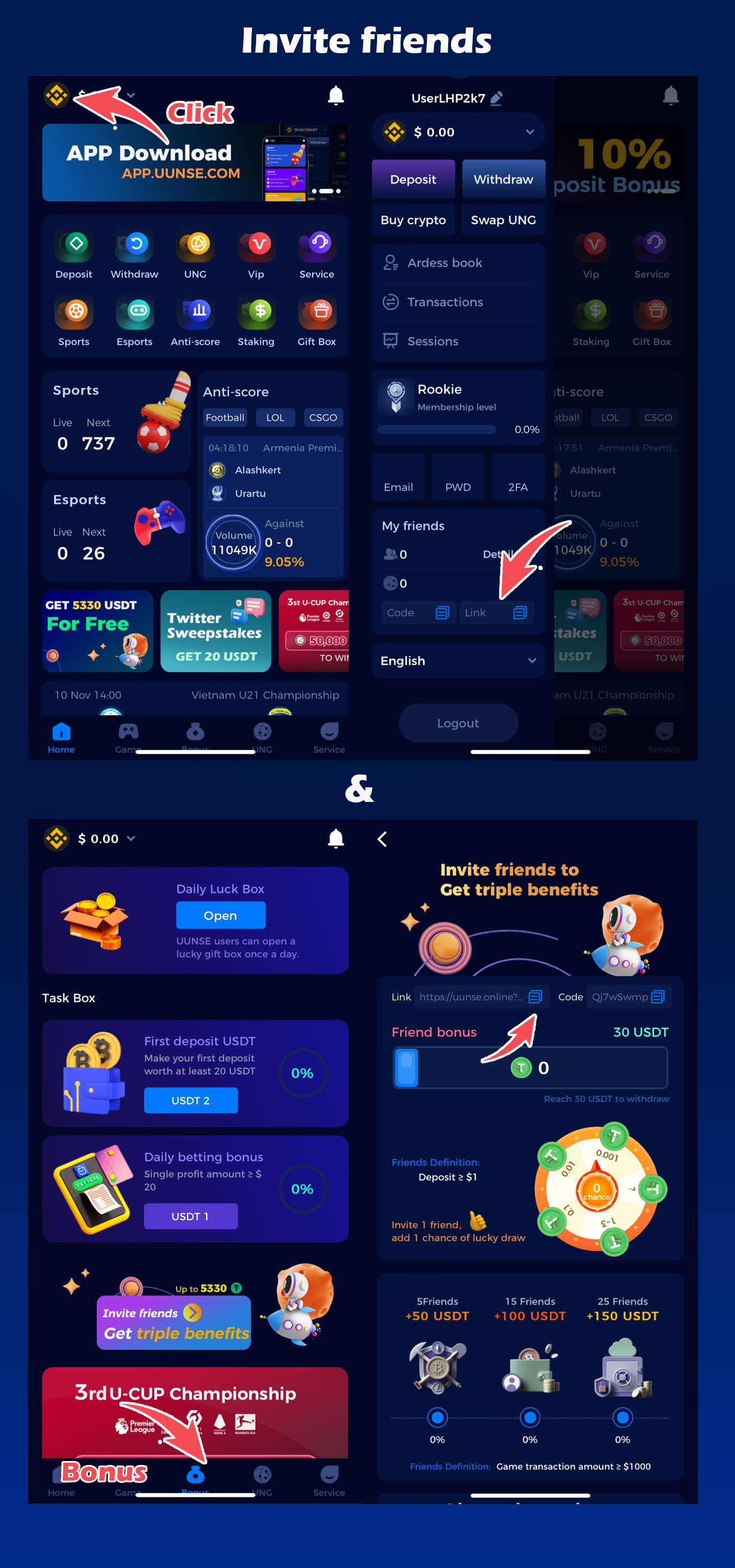 Milestone Bonus. When the number of your friends who have reached the game flow requirement reaches 5, 10 and 20 respectively, you will be rewarded with the corresponding USDT.